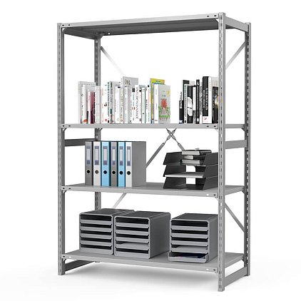 Стеллаж комплектуется сплошными металлическими полками, покрыт порошковой полимерной краской светло-серого цвета (RAL 7035).